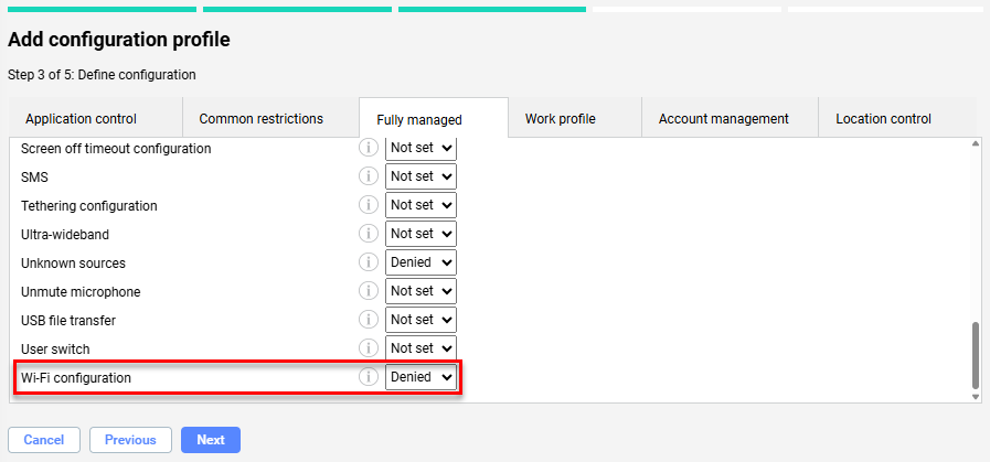 You can limit access only to the Wi-Fi networks set up via this configuration profile for fully managed devices. To do so, use the restriction designed for this purpose. You can configure the restriction by navigating to Configuration profiles > Android > Restrictions and choosing Denied for the Wi-Fi configuration option on the Fully managed tab.